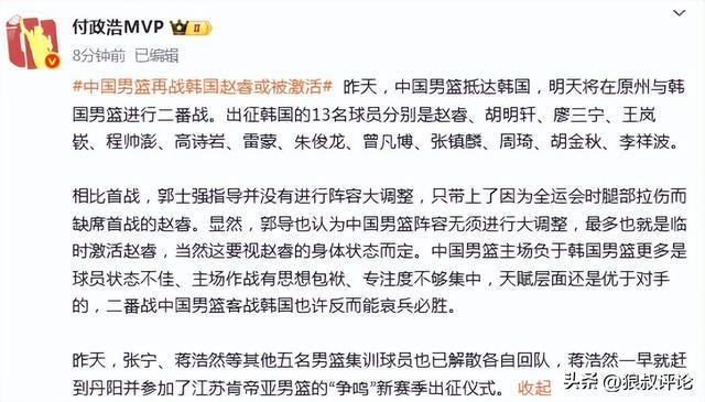 相比首战,郭士强指导并没有进行阵容大调整,只带上了因为全运会时腿部拉伤而缺席首战的赵睿。显然,郭导也认为中国男篮阵容无须进行大调整,最多也就是临时激活赵睿,当然这要视赵睿的身体状态而定。中国男篮主场负于韩国男篮更多是球员状态不佳、主场作战有思想包袱、专注度不够集中,天赋层面还是优于对手的,二番战中国男篮客战韩国也许反而能哀兵必胜。