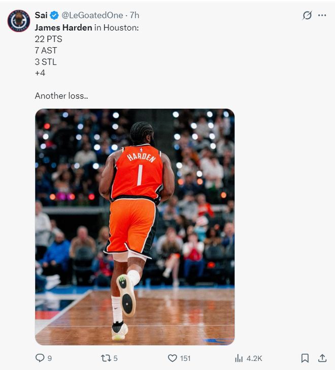 此役哈登下半场只休息了1分30秒,打了40分22秒,18中7,三分10中4,罚球5中4,拿到22分7助攻3篮板3抢断4失误,末节关键时刻还命中了一个绝平三分,正负值+4。