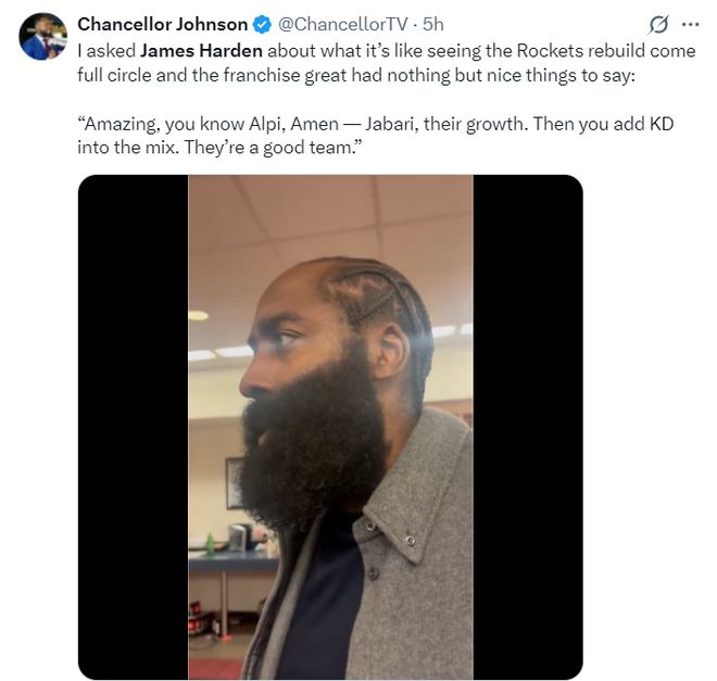 赛后哈登接受采访谈到这支全新的休斯顿火箭队:太棒了他们,你知道的,他们有阿尔佩伦(申京)、阿门、小贾巴里,这些年轻人成长的很快,然后杜兰特也被加起来了,他们已经是一支非常棒的球队。