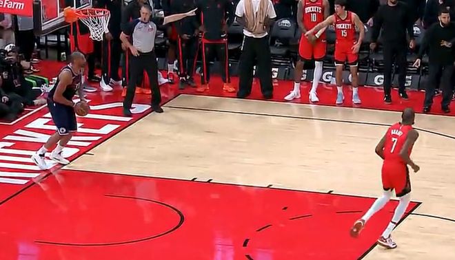 看了比赛的球迷都知道巴图姆有一个发球踩线违例直接葬送比赛,很多人指责哈登不去接球,实际上乌度卡的战术就是用奥科吉贴着哈登不让登哥接球,哈登示意了队友3-4秒回后场来接球,结果没有一个人回应。